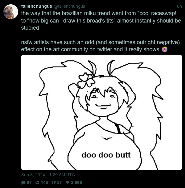 Thirsting for the popular character Hatsune miku but someone changed her to wear basicly nothing and have massive tits lol